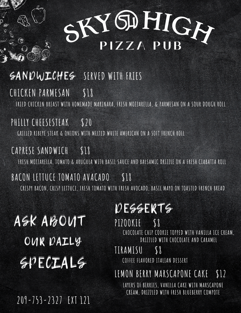 Welcome to Sky High Pizza & Pub, where the flavors soar as high as the views in beautiful Bear Valley, CA. This charming establishment offers a delightful menu centered around wood-fired pizzas that are crispy, flavorful, and expertly crafted. Guests rave about the perfect sauce-to-cheese ratio and the tender chicken tenders that accompany them.